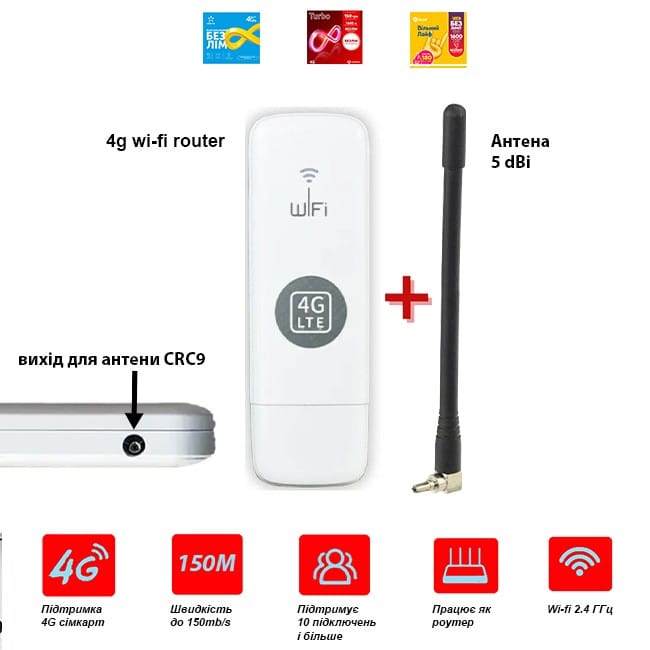 Wi-Fi роутер 4G LTE – здатний забезпечити максимальну швидкість завантаження даних, на швидкості до 150 мбіт/с в 4G LTE мережах, так само до 42 мбіт/с в стандарті 3G. Для роботи достатньо встановити SIM карту будь-якого оператора: Київстар, Vodafone, Lifecell – підключення до інтернет відбудеться автоматично і без додаткових настроїв. Усі підтримувані частоти 4G для України: 900 (B8), 1800 (B3) та 2600 (B7). Швидкість інтернет дозволить переглядати відео онлайн високої якості, швидке завантаження великих файлів, перегляд SmartTV та миттєве надсилання повідомлень