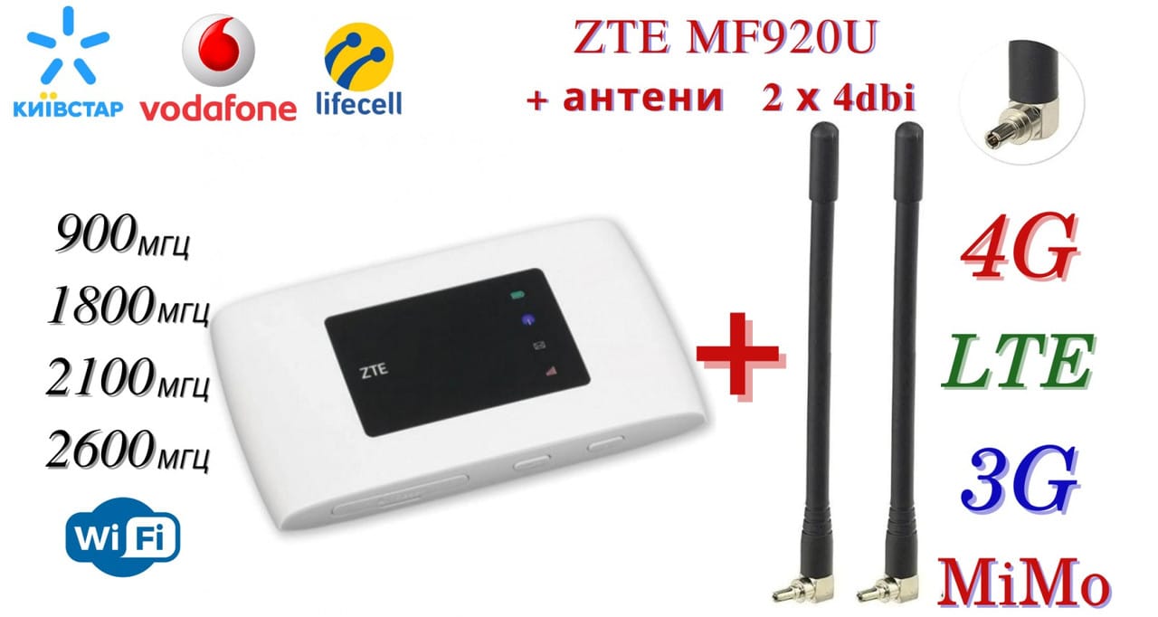 ZTE MF920 – це кишеньковий 4G/3G WiFi роутер, в першу чергу призначений для роботи в мережі мобільних операторів Vodafone, Kyivstar і Lifecell для України, або інших операторів по всьому світу. Повноцінна підтримка В мережі 2G/3G/4G LTE, на максимальної швидкості передачі даних до 42 Мбіт/сек за технологіями HPA/HSPA+/DC-HSPA+ і до 150 Мбіт/сек за технологією LTE. Для роботи вам слід встановити у роутер SIM-карту будь- якого оператора, автоматично відбудеться з’єднання з інтернетом, без додаткових параметрів. Підійдуть як для домашнього користування, подорожей по Україні, так і для використання в сільській місцевості в якості домашньої точки доступу